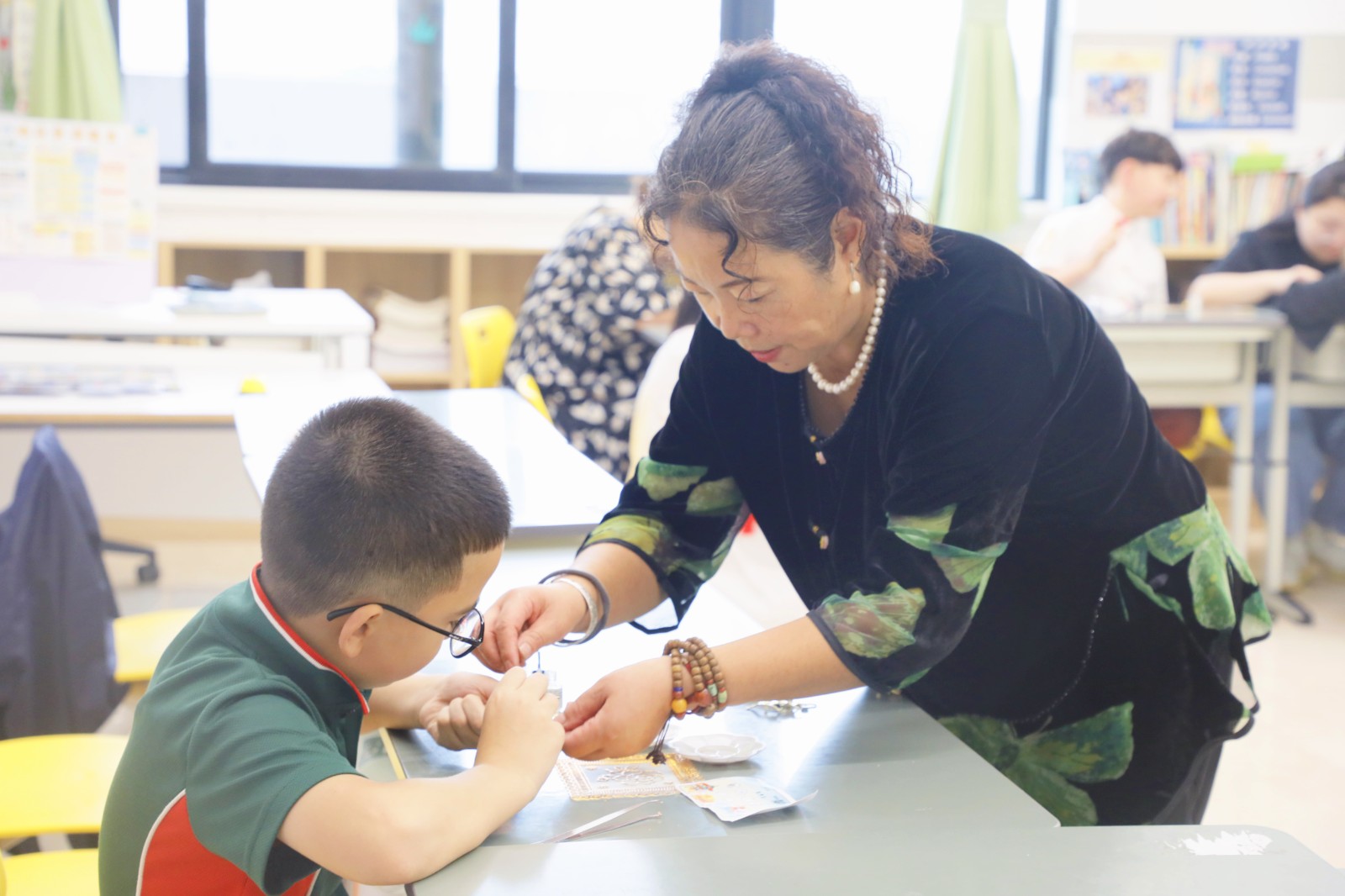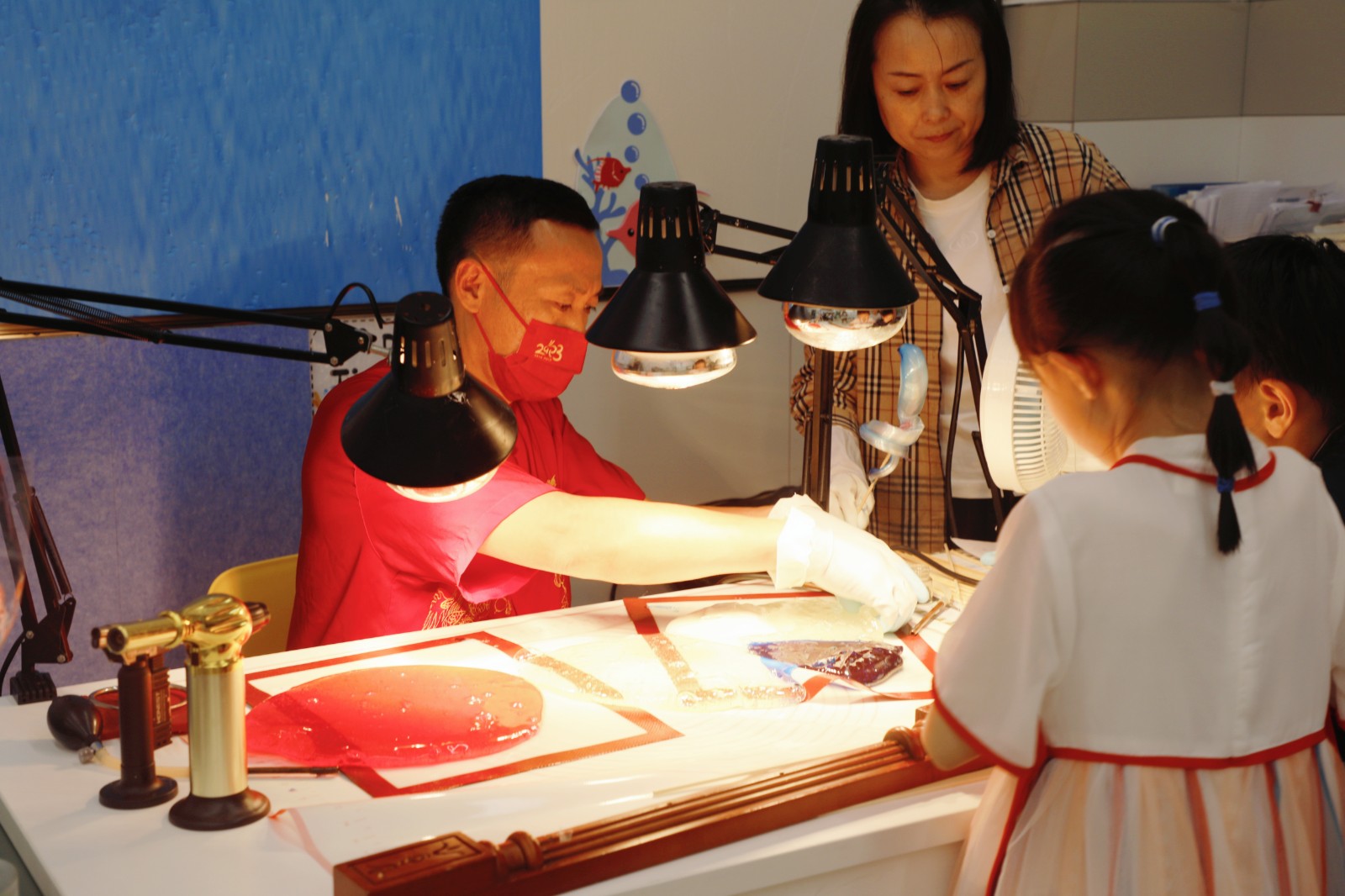 还有更多非遗体验:吹糖人、螺钿、宋锦……同学们排着队,看着糖稀变成鲸鱼、贝壳片拼出花纹,眼里满是跃跃欲试。原本节后“不想参与”的娃,反而主动排队、积极尝试,从被动应付变成了主动投入。