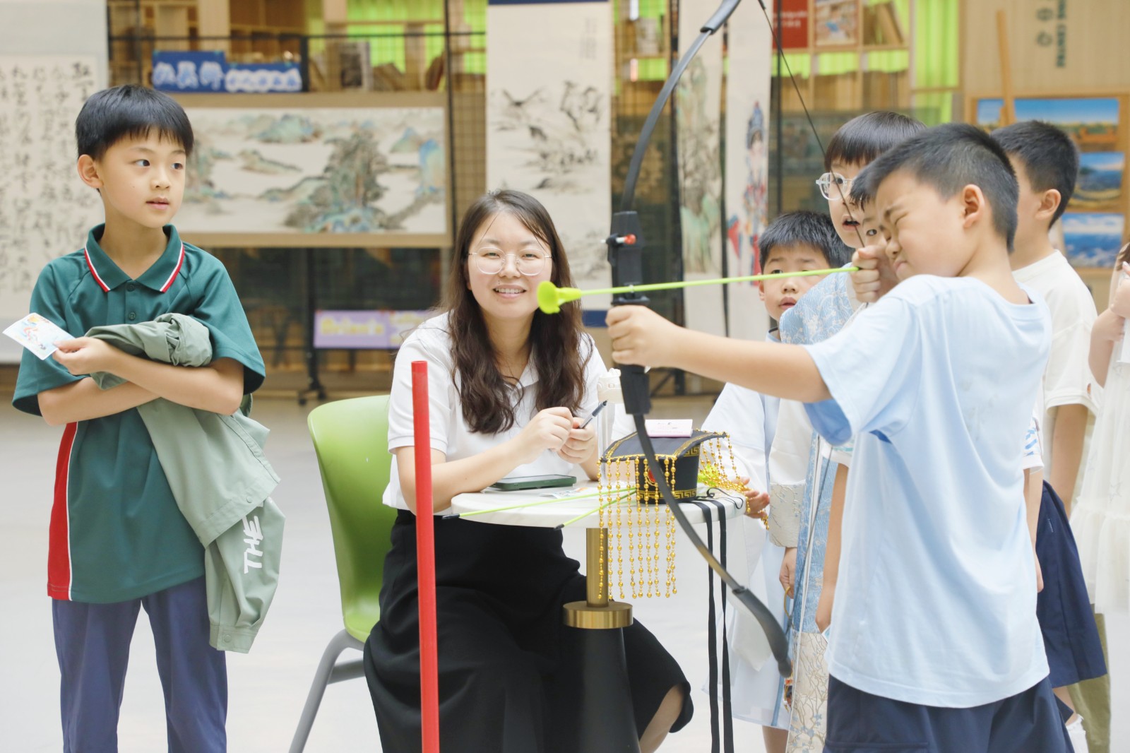 游戏区更是欢乐聚集地:蹴鞠比赛里,同学们瞄准射门点,跑着跑着就忘了“假期的懒劲儿”;投壶区前,大家排着队丢箭;诗词配对游戏里,老师和学生对上暗号“床前明月光,疑是地上霜”,玩着玩着,就悄悄巩固了文化知识。