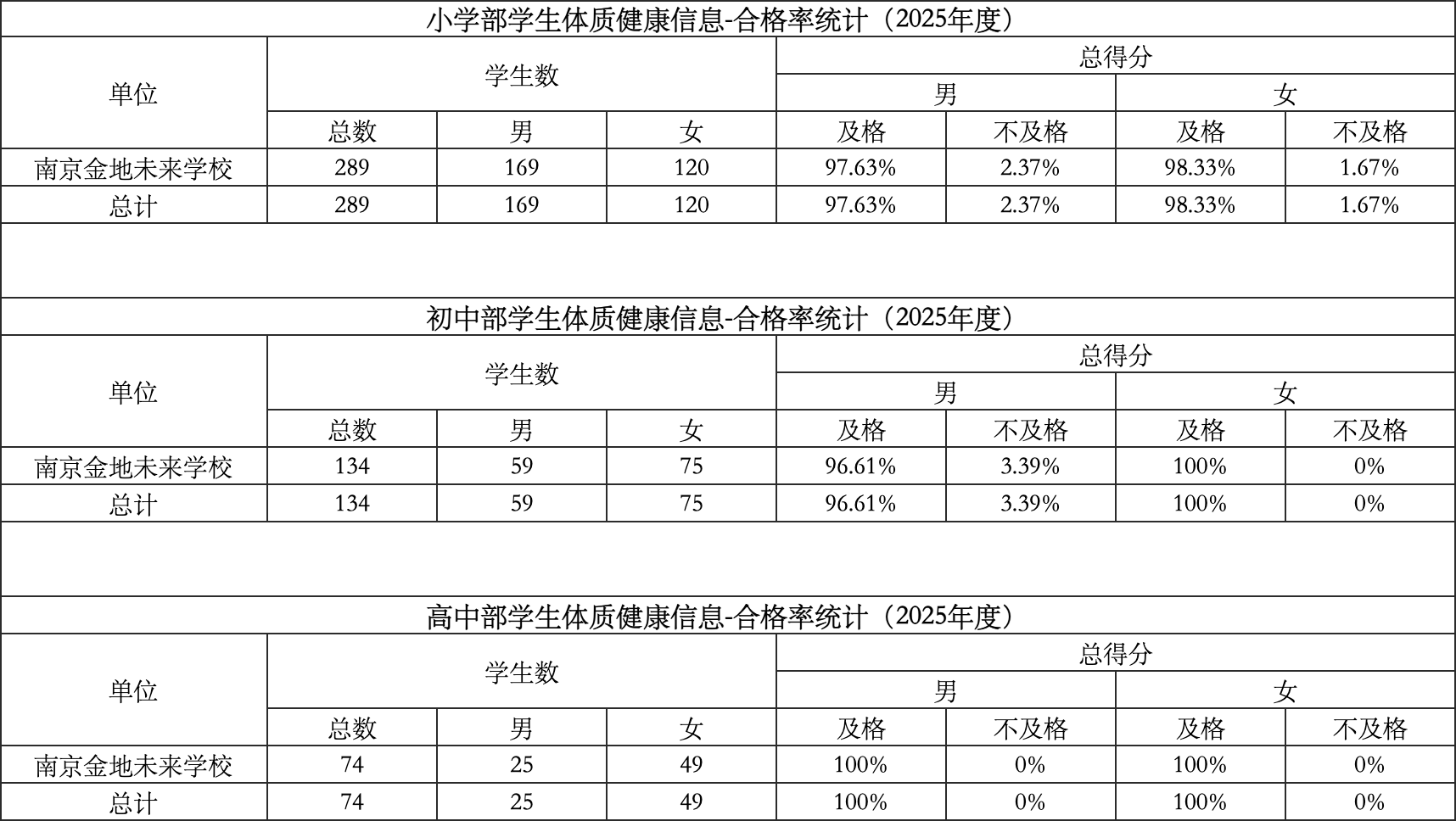 南京金地未来学校体测合格率公示